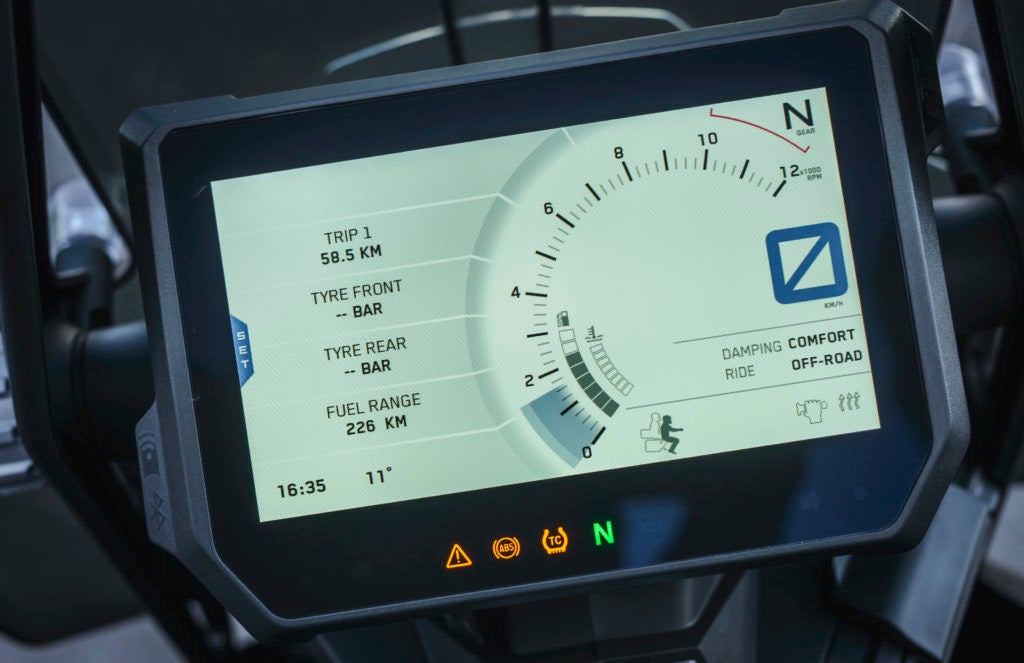 Dashboard volledig naar eigen zin in te delen. Met de omhoog en omlaag knop aan de linkerzijde is een snel menu op te roepen. Bij mij nu damping en ridingmode maar kan ook bv handvatverwarming zijn waardoor dit soort zaken snel op te roepen zijn.