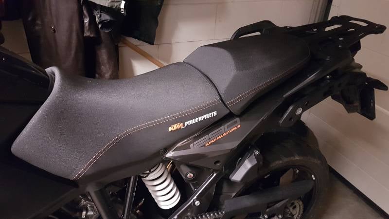 In Frankrijk toch wel wat last van zadelpijn. Op de Yamaha had ik daar nagenoeg geen last van. Dus toch maar gegaan voor het powerparts zadel. De zithoogte wordt daarmee 2 cm hoger en hij zit inderdaad een stuk beter.