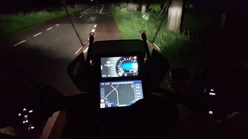 Bochtenverlichting. Als je de bocht in gaat schakelen er afhankelijk van de hellingshoek tot 3 lampen bij om in de bocht te schijnen.